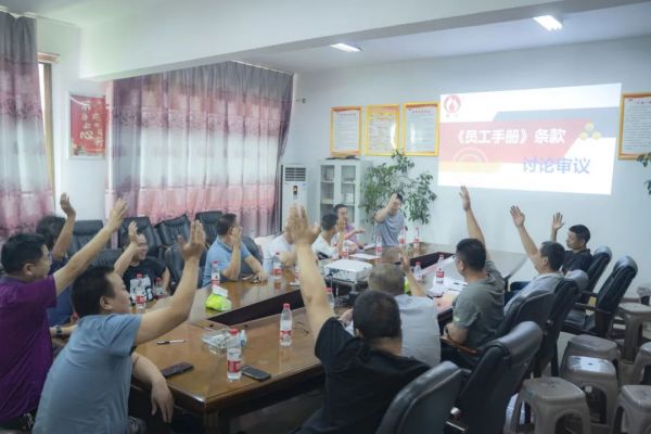 會(huì)議環(huán)節(jié),安環(huán)委主任通篇朗讀新版《員工手冊(cè)》安全管理?xiàng)l款,公司各部門中層及以上管理人員共同討論審議,舉手表決,全票通過。新版《員工手冊(cè)》將于2023年7月在朝陽(yáng)集團(tuán)正式啟用執(zhí)行。